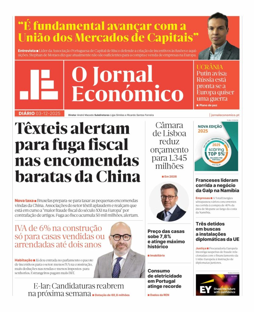 Veja aqui a primeira página do Jornal Económico desta quarta-feira, 3 de dezembro: